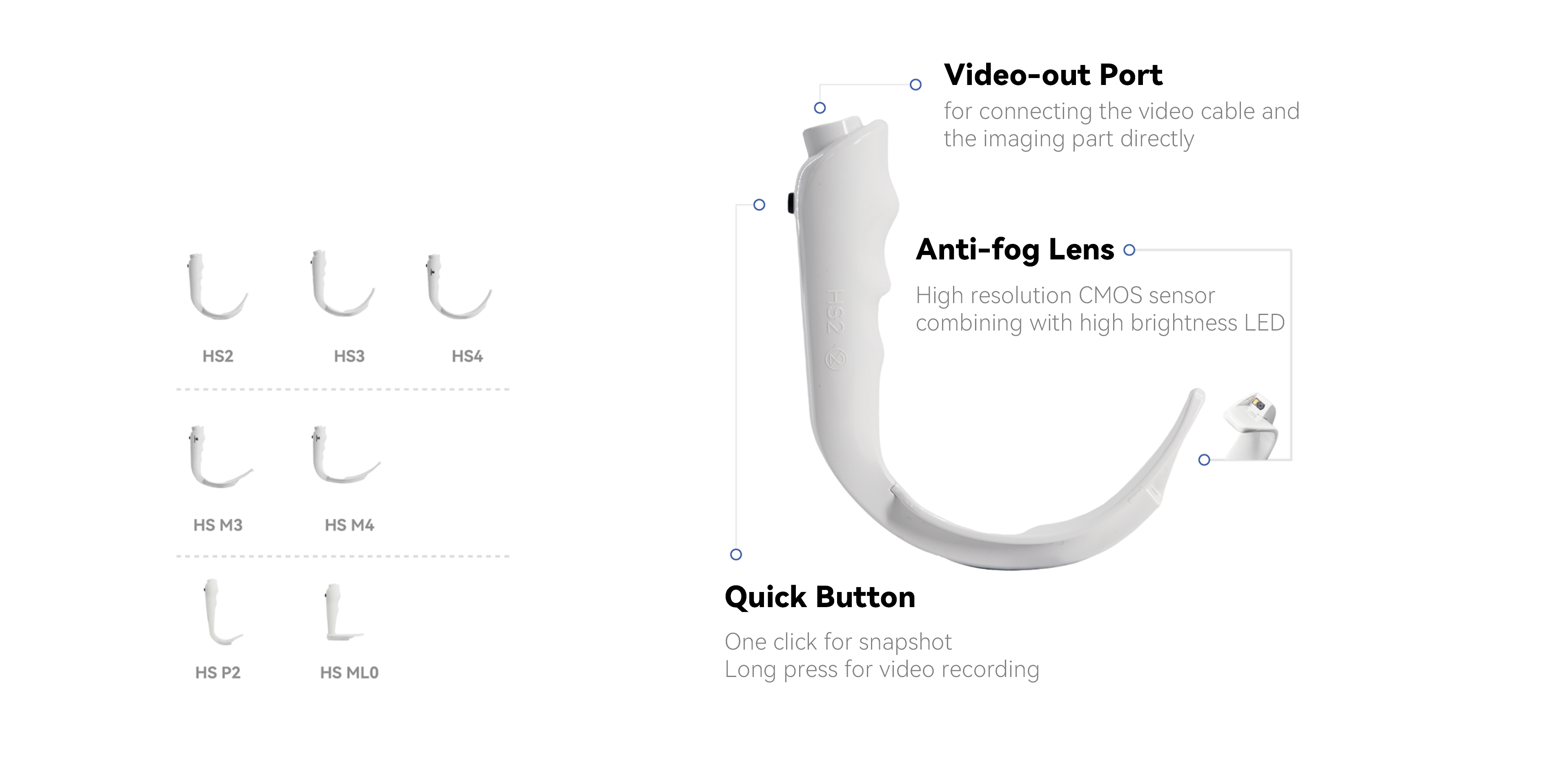 The Semi-sleevd Blades fuction with Handle-AD which is compatible with 5 Mac-type blades, as well as 3 CMac blades allowing endotracheal tubes to pass through the channels on the blades. This combination allows users to carry one handle and pair it with multiple blades to meet various on-site needs.