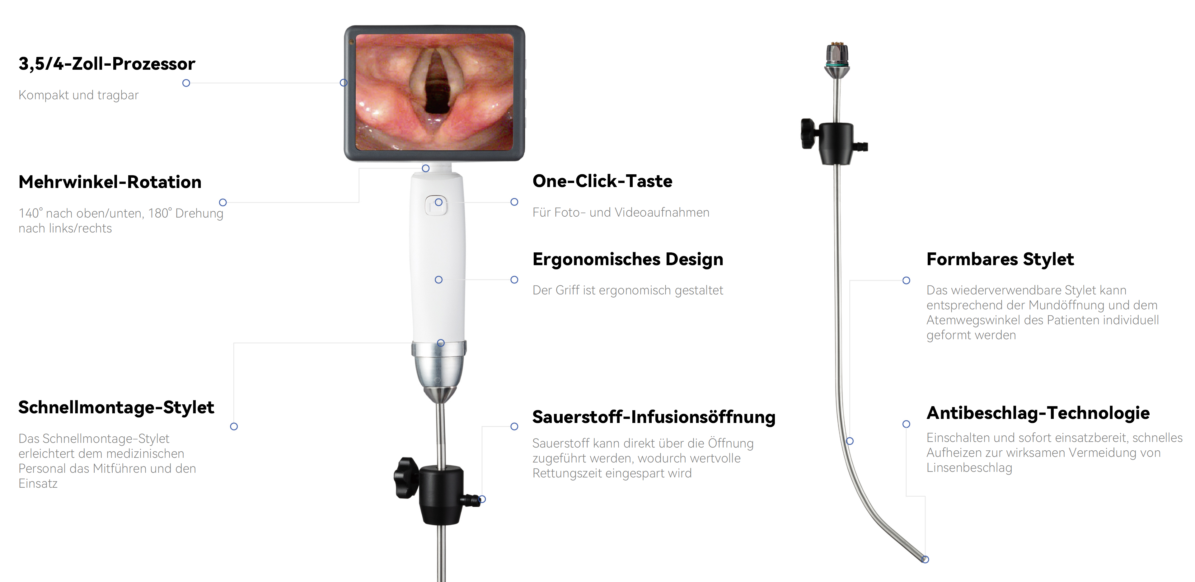 Ausgestattet mit einem drehbaren Display, das sich um 140° nach oben/unten neigen und um 180° nach links/rechts schwenken lässt, sowie einer hochauflösenden, beschlagfreien Kamera, ermöglicht das Gerät eine klare und flexible Visualisierung für Anwender.