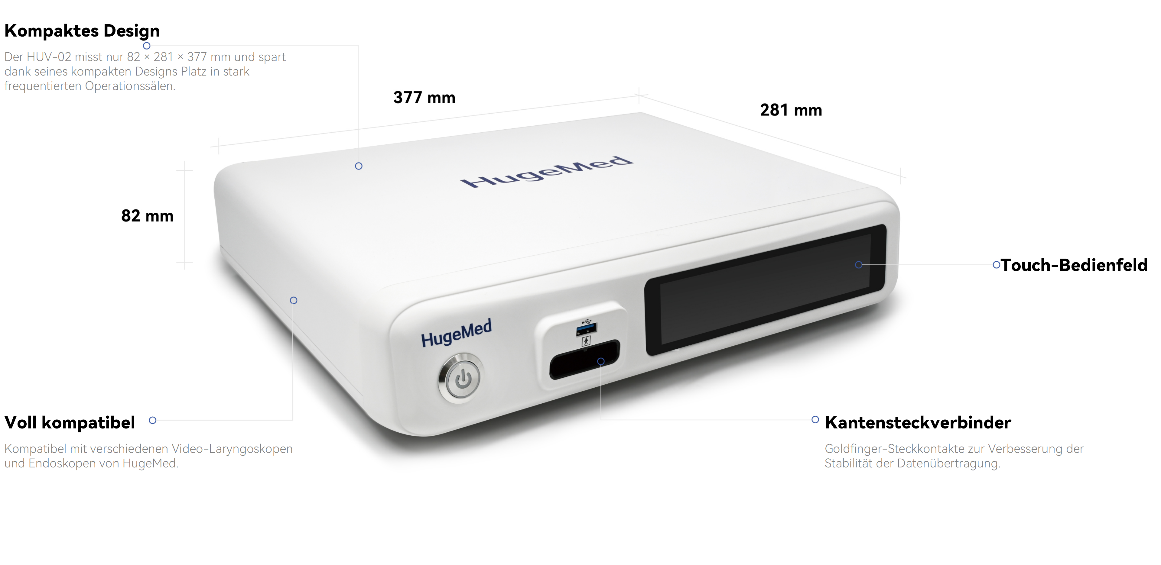 Der Bildprozessor HUV-02 erfasst und verarbeitet Bilder von Endoskopen und gibt diese an externe Displays aus. Er liefert klare, hochwertige Bilddarstellungen und ermöglicht ein intuitives Bedienerlebnis bei chirurgischen Eingriffen.