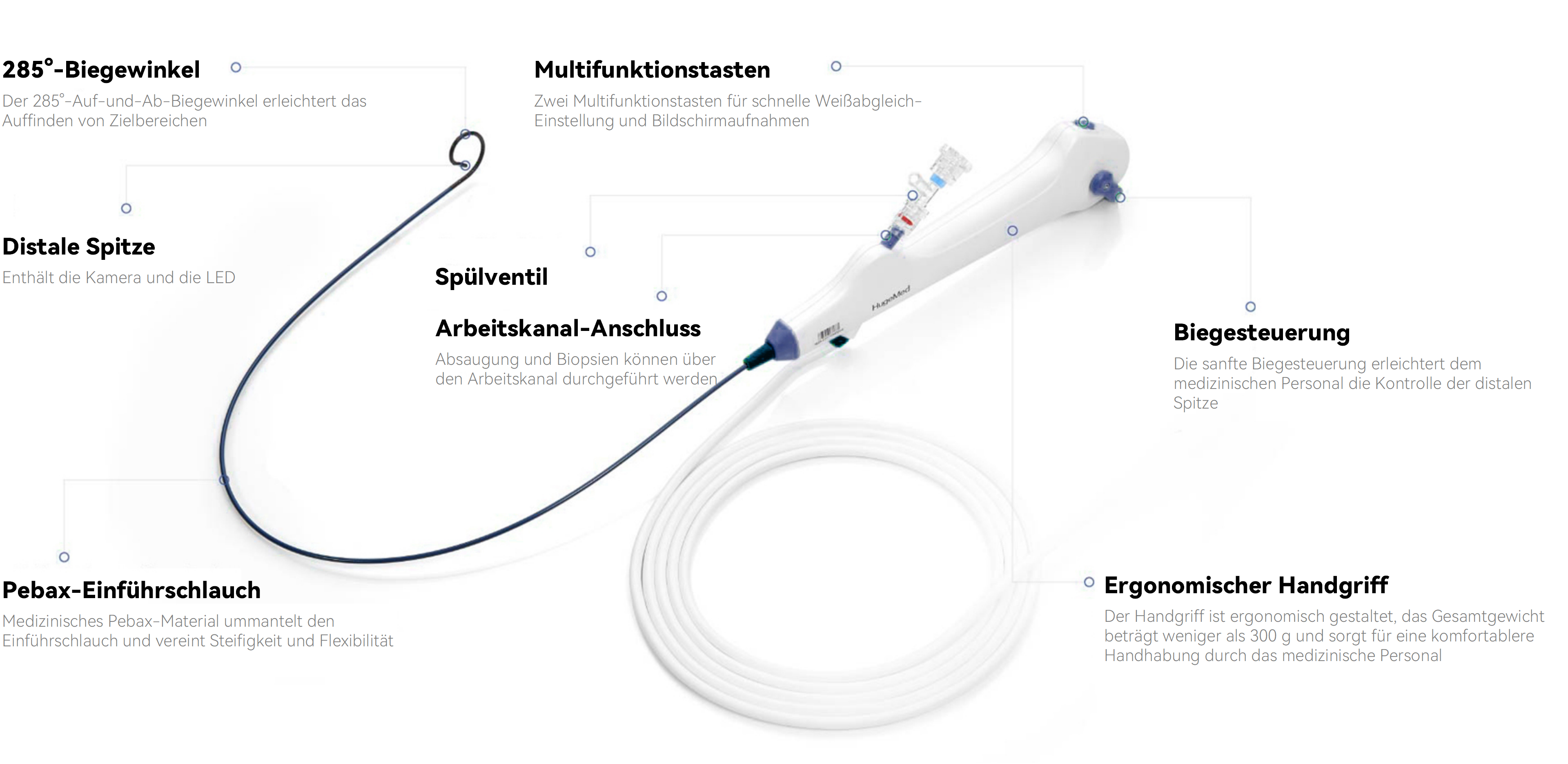 Mit einem Gewicht von unter 300 g reduziert der HU30M die Ermüdung des Operateurs bei längeren Eingriffen deutlich. Serienmäßige Funktionen wie ein verstellbarer Winkelknopf, ein Biegebereich von 285°, ein 1080p-Optimierungsalgorithmus sowie eine passive Biegefunktion unterstützen Ärztinnen und Ärzte dabei, selbst anspruchsvollste Operationen sicher und effizient durchzuführen.