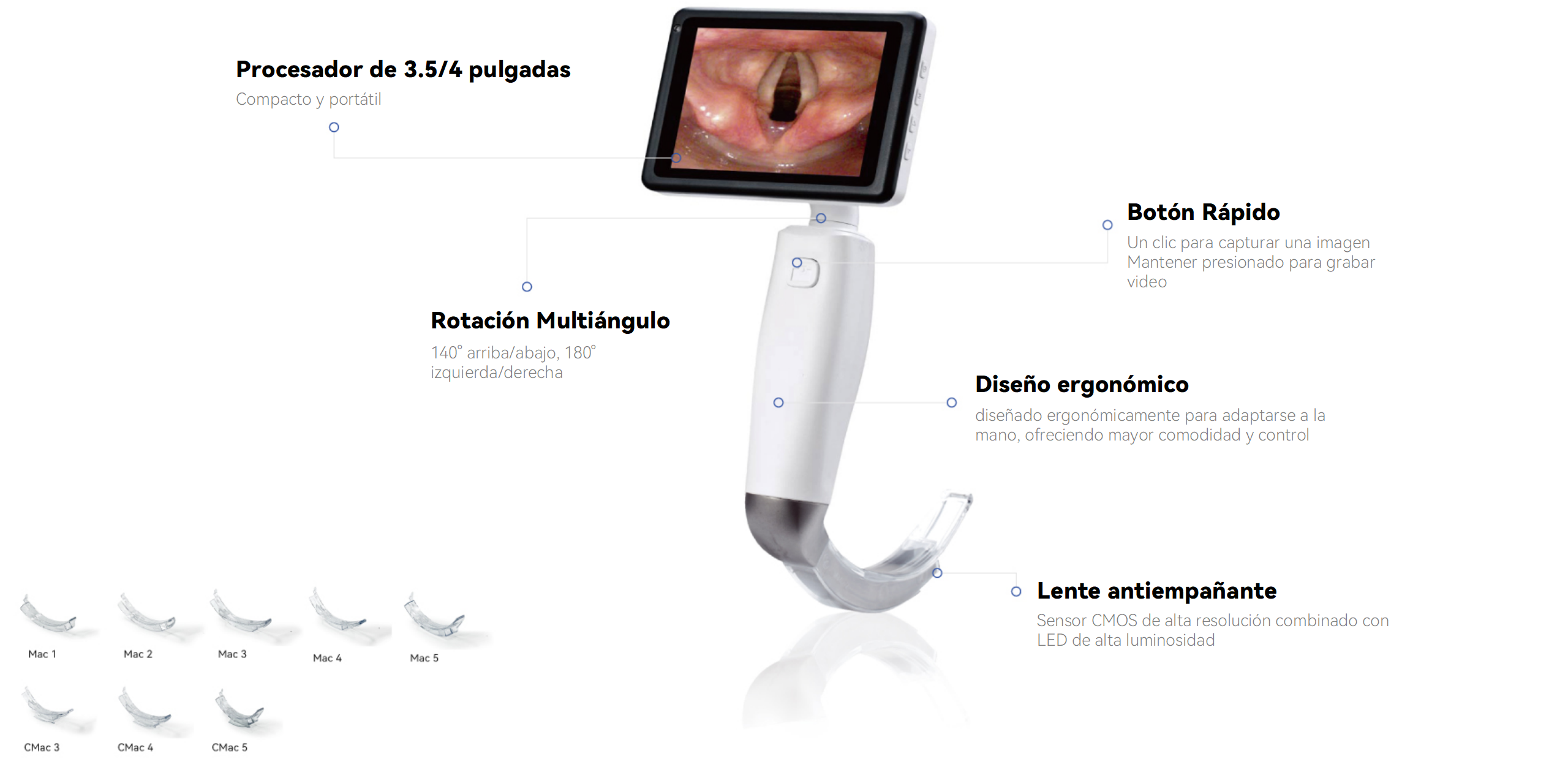 Equipado con una pantalla rotatoria de 3.5/4 pulgadas que se inclina 140° hacia arriba/abajo y gira 180° hacia la izquierda/derecha, junto con una cámara antiempañante de alta resolución, el dispositivo permite una visualización clara y flexible para los clínicos.
