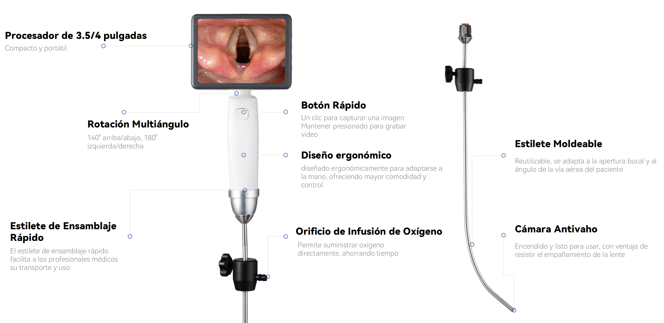 Equipado con una pantalla rotatoria de 3.5/4 pulgadas que se inclina 140° hacia arriba/abajo y gira 180° hacia la izquierda/derecha, junto con una cámara antiempañante de alta resolución, el dispositivo permite una visualización clara y flexible para los clínicos.