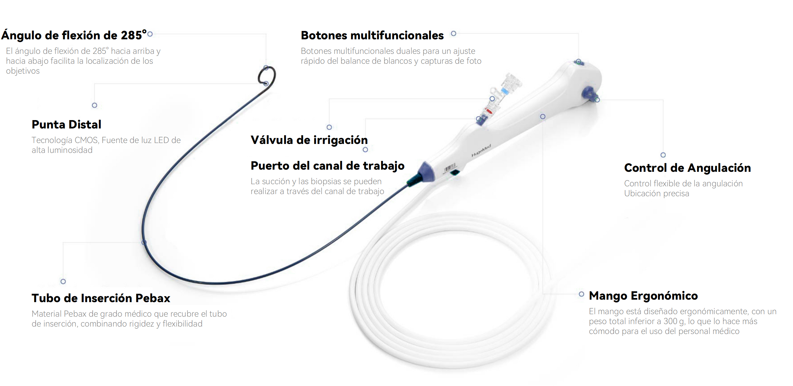 Con un peso inferior a 300 g, el HU30M reduce eficazmente la fatiga del cirujano durante procedimientos prolongados. Sus características estándar, que incluyen un mando ajustable de ángulo, un rango de flexión de 285°, un algoritmo de optimización 1080P y función de flexión pasiva, apoyan a los médicos para afrontar con facilidad incluso las cirugías más desafiantes.