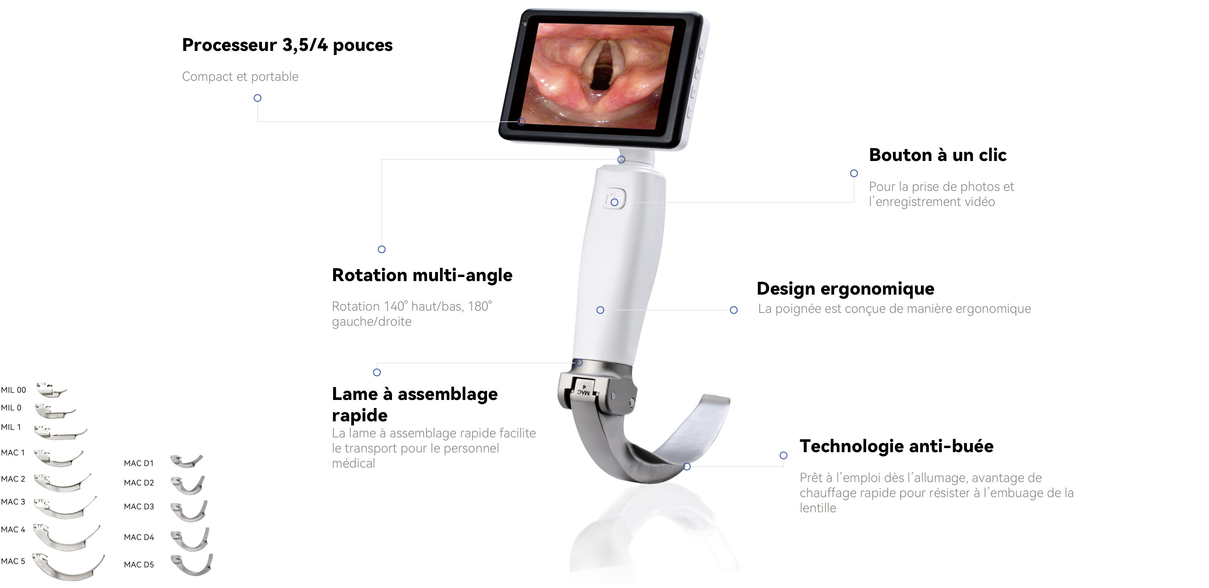 Équipé d’un écran rotatif de 3,5/4 pouces pouvant s’incliner de 140° vers le haut ou vers le bas et pivoter à 180° vers la gauche ou la droite, ainsi que d’une caméra anti-buée de haute résolution, l’appareil offre aux cliniciens une visualisation claire et flexible.