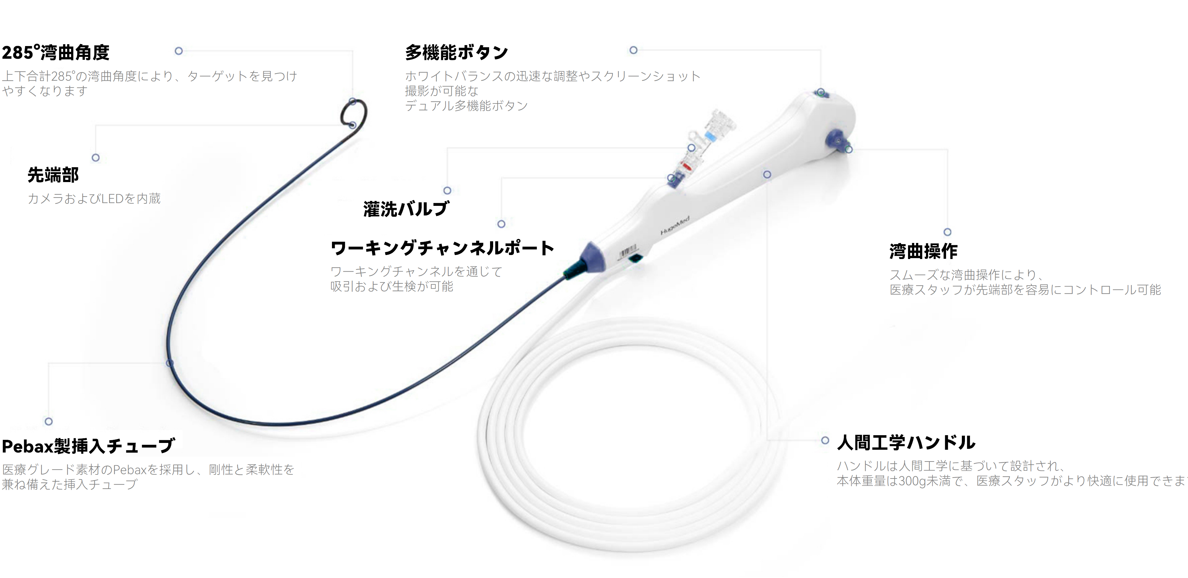HU-30B 本体の重量は 300g 未満。長時間の手術でも術者の負担を軽減します。標準搭載された:角度調整ノブ、280°の上下湾曲、1080P 最適化アルゴリズム、パッシブベンディング機能、これらが組み合わさり、難易度の高い手技でも医師を強力にサポートします。