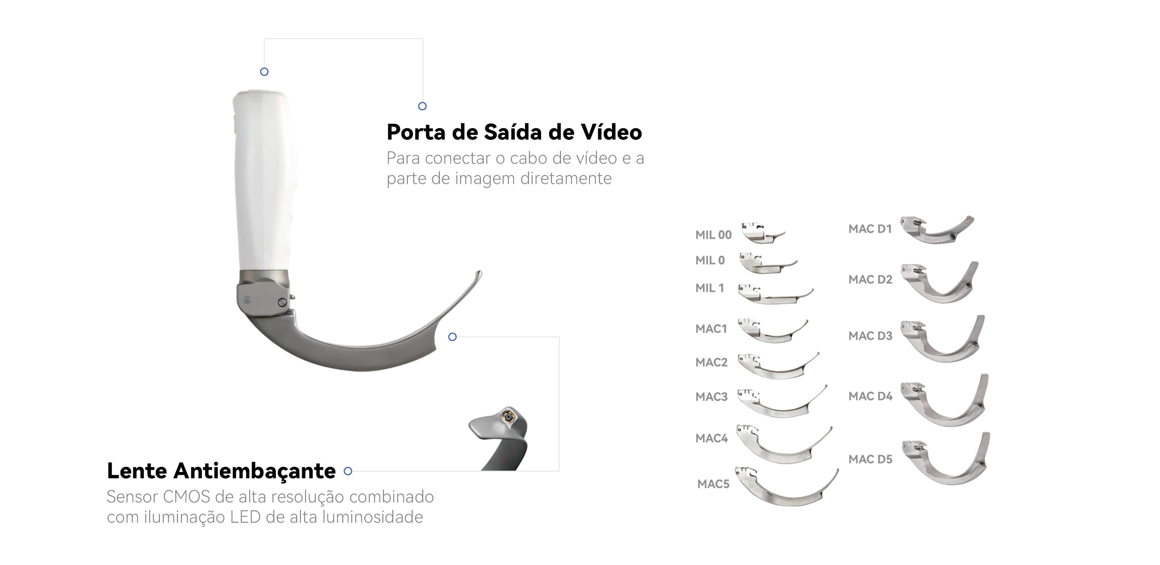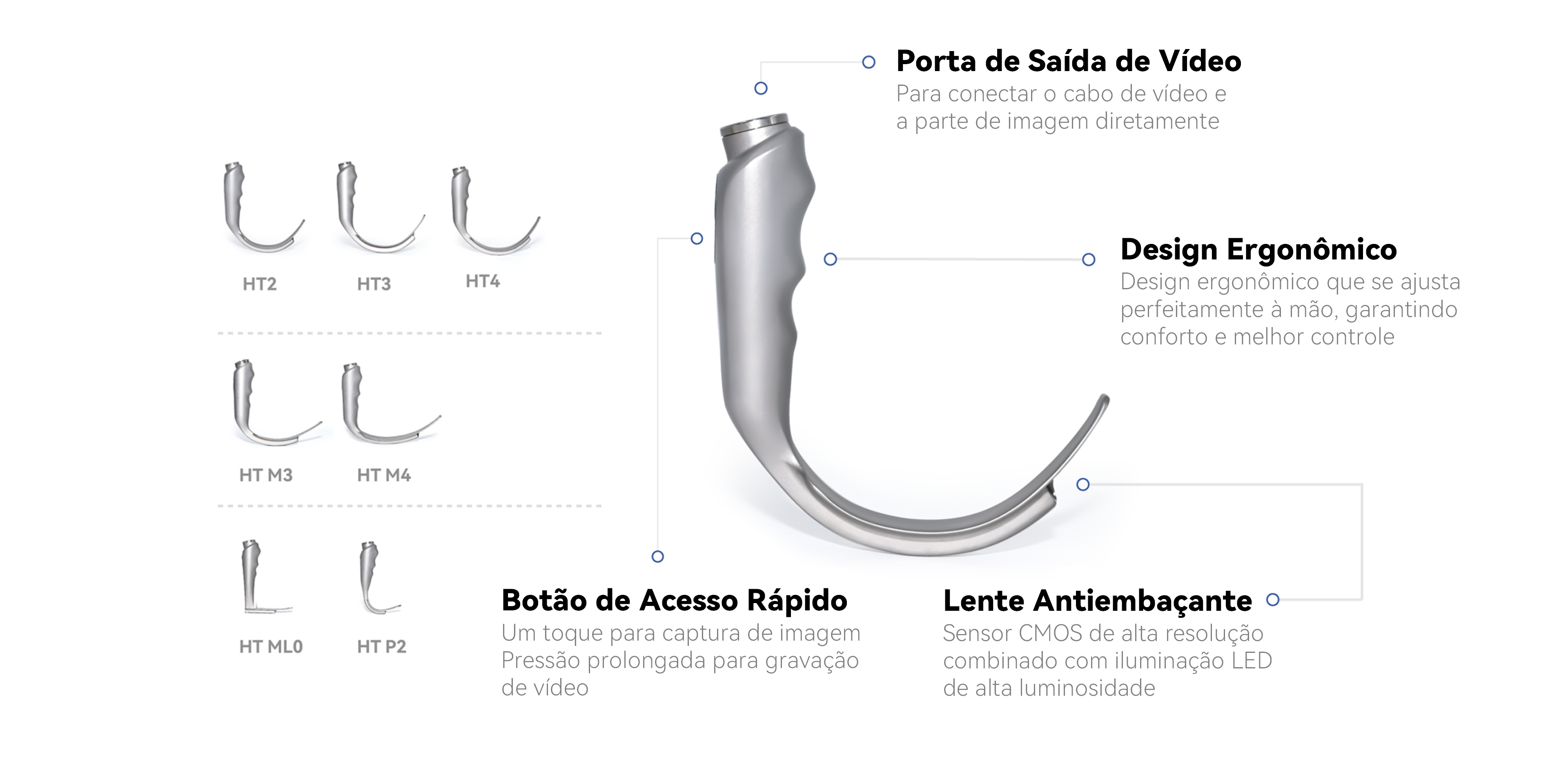Com design modular, cabo destacável e 13 modelos reutilizáveis de lâminas, as lâminas de aço inoxidável são ideais para ambientes de emergência e cuidados intensivos, onde diversos tipos de pacientes podem ser atendidos. O aço inoxidável 316L de grau médico confere à lâmina resistência excepcional e alta resistência à corrosão.