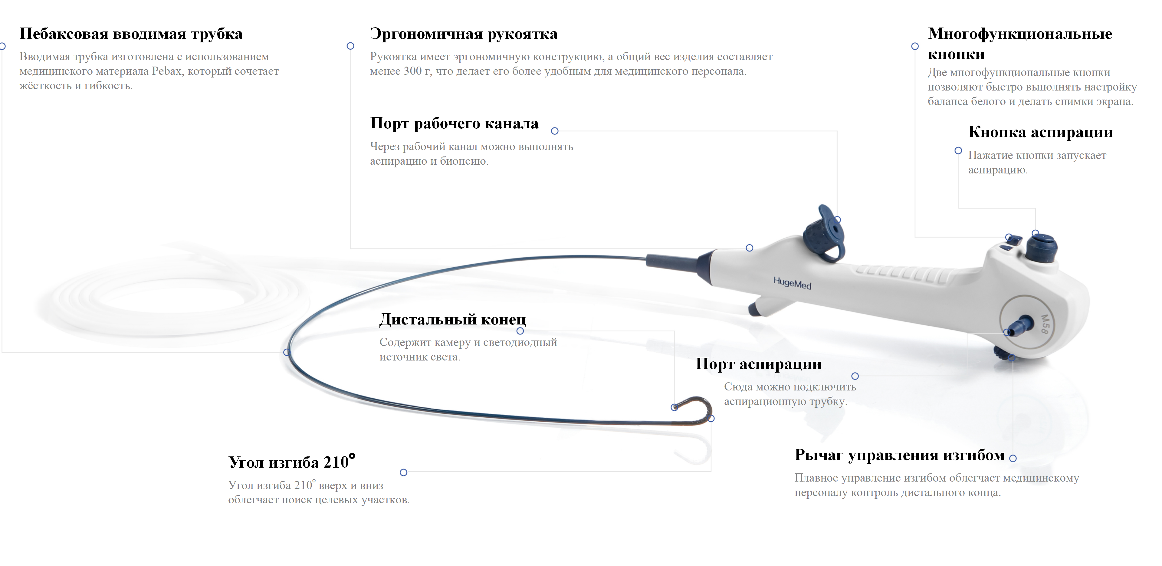 Изгиб дистального конца на 210° вверх/вниз в сочетании с технологией пассивного изгиба позволяет легко проходить сложные участки изгиба. Это обеспечивает точный доступ к целевой области для точной диагностики и лечения.