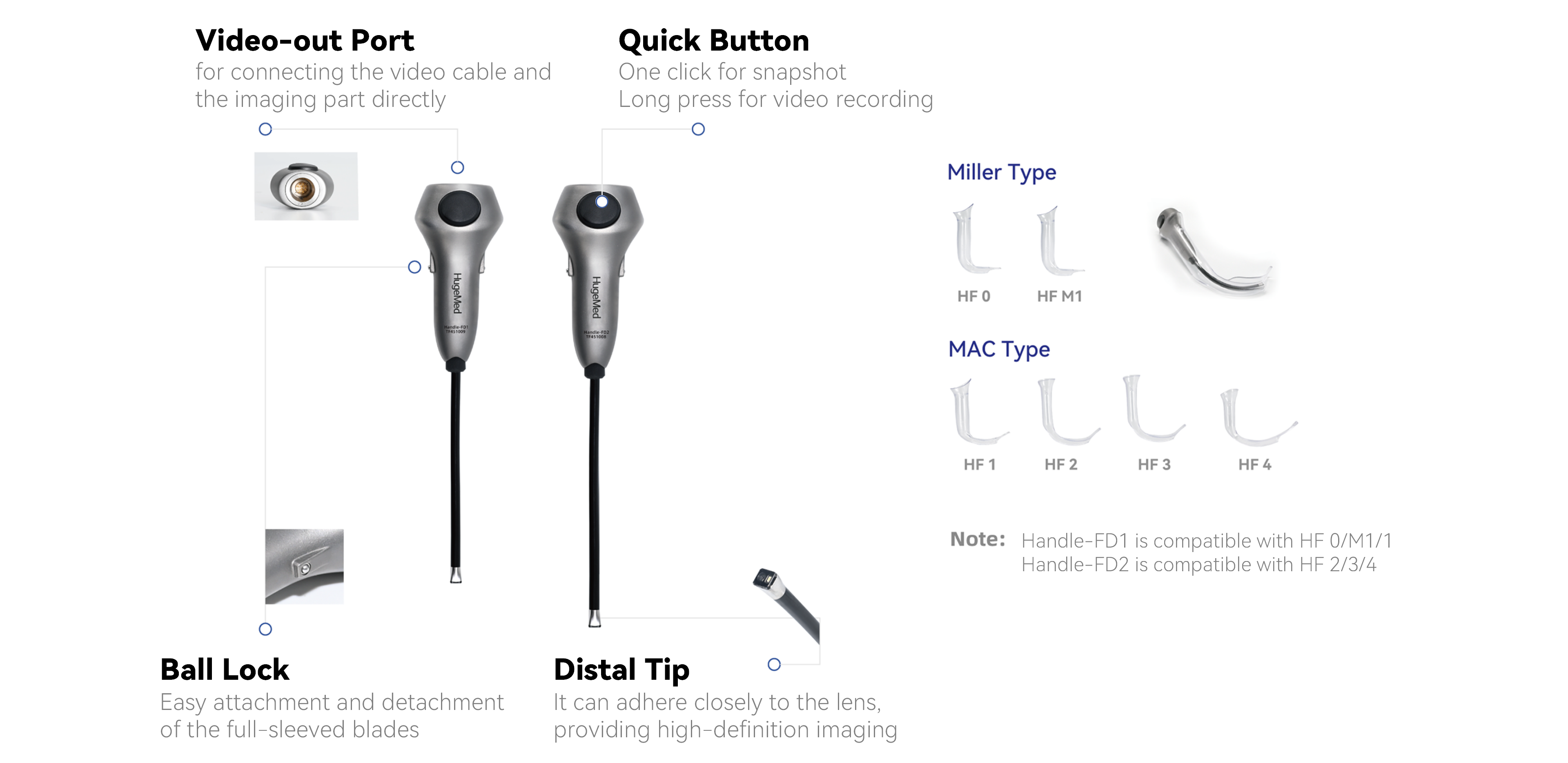 The full-sleeved blades function with Handle-FD1 or Handle-FD2. Covering most part of the handle, the full-sleeved design provides higher safety level. Handle-FD1 and Handle-FD2, with high waterproof level, can undergo immersion disinfection. Four macintosh blades and two miller blades can cover various clinical requirements.