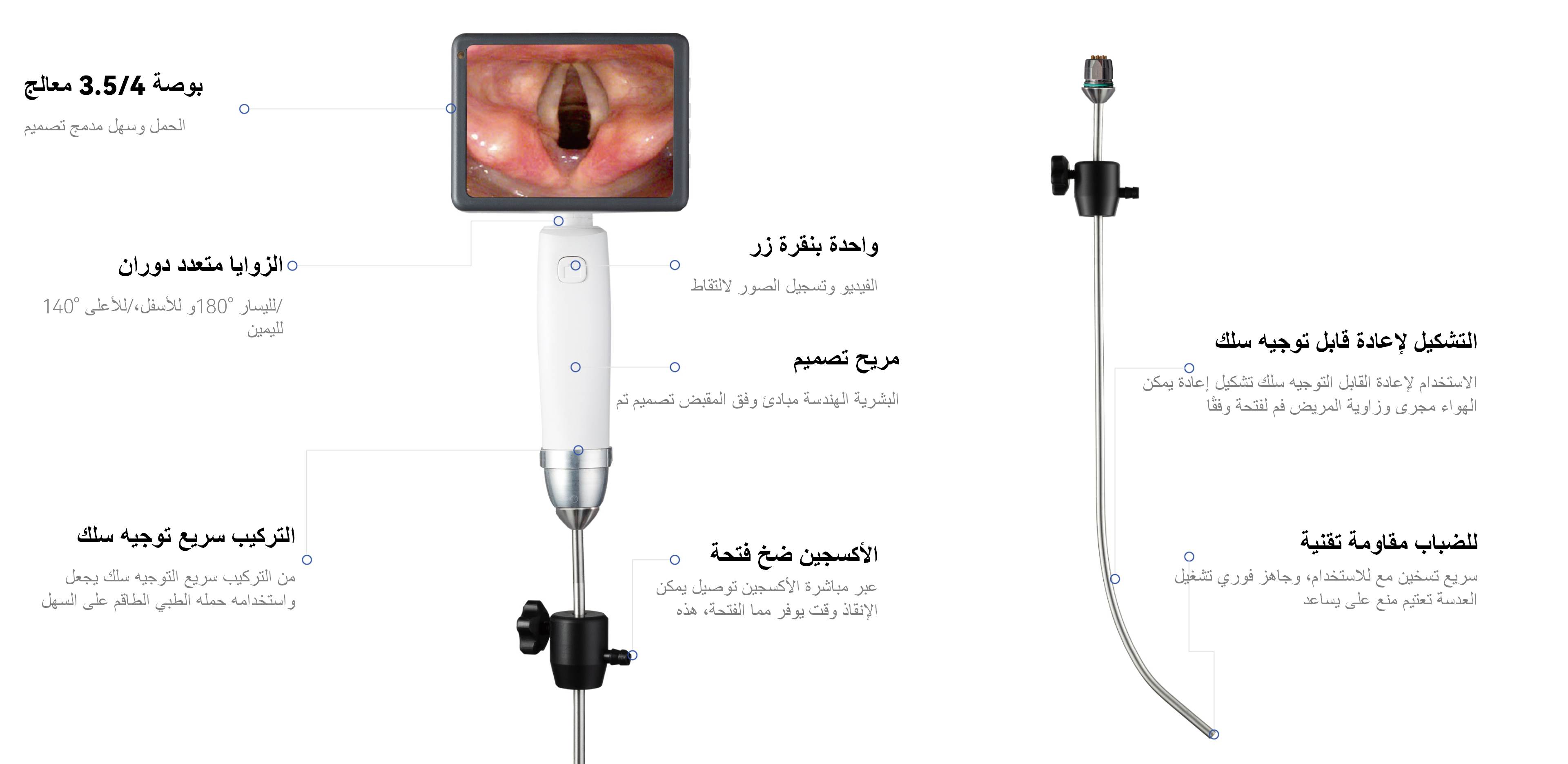 مزوّد بشاشة قابلة للدوران تميل 140° للأعلى/للأسفل وتدور 180° لليسار/لليمين، إلى جانب كاميرا عالية الدقة مضادة للضباب، ما يتيح للأطباء رؤية واضحة ومرنة.