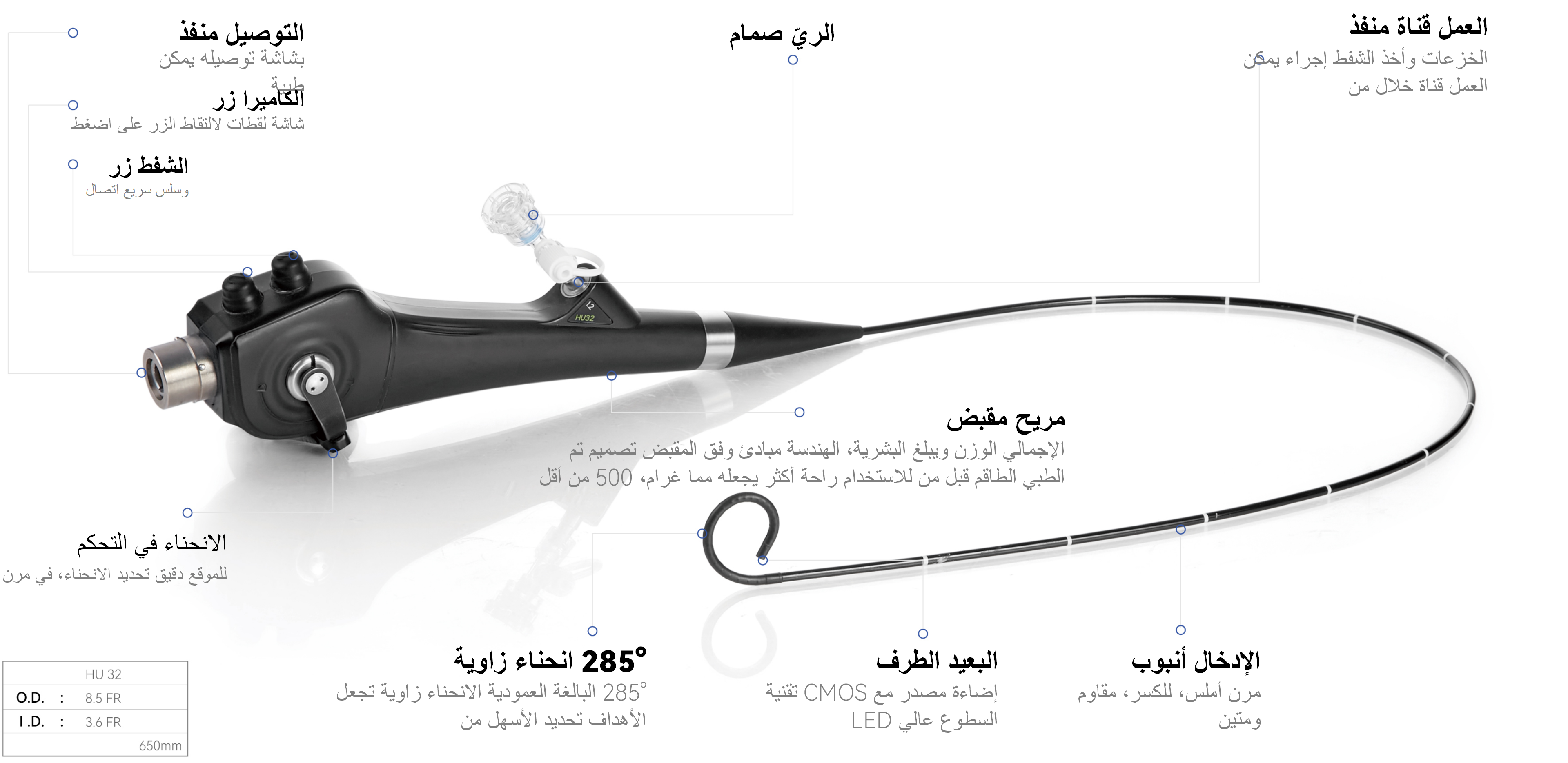 يمكن إعادة استخدام منظار الحالب والكلية القابل لإعادة الاستخدام بعد التعقيم بالغمر، ما يقدّم بديلًا اقتصاديًا للأجهزة أحادية الاستخدام. ويضمن أنبوب الإدخال المرن وزاوية الانحناء 285° قدرة مناورة محسّنة دون نقاط عمياء، مما يعزّز راحة المريض وكفاءة الإجراء.