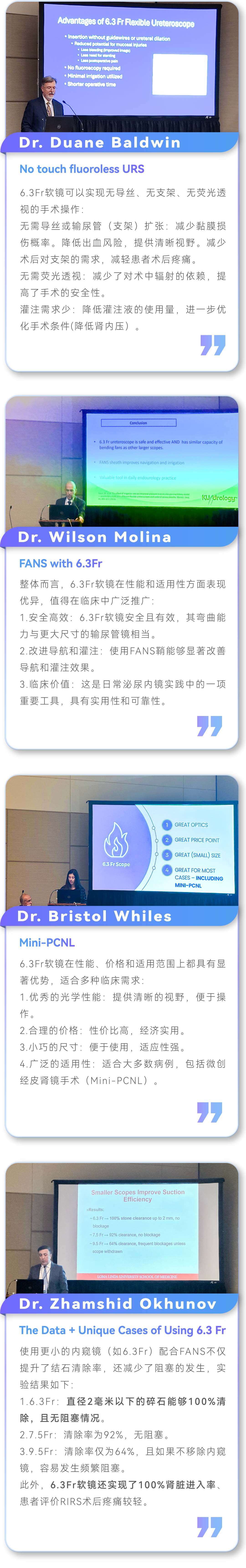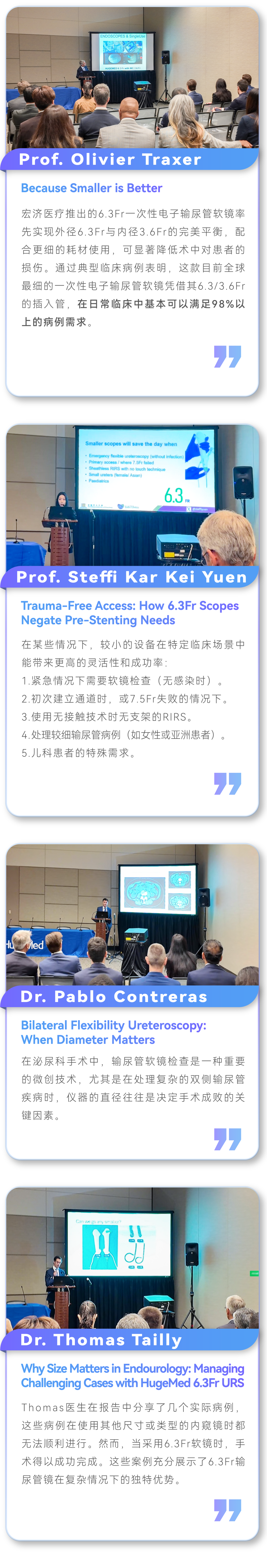 第二场 Workshop 聚焦于无支架无导丝无透视理念、可弯曲负压吸引鞘FANS等方面的研究。研究表明6.3Fr能实现100%清除直径2毫米以下的碎石且无阻塞情况,此外6.3Fr软镜还实现了100%肾脏进入率、患者评价RIRS术后疼痛较轻。