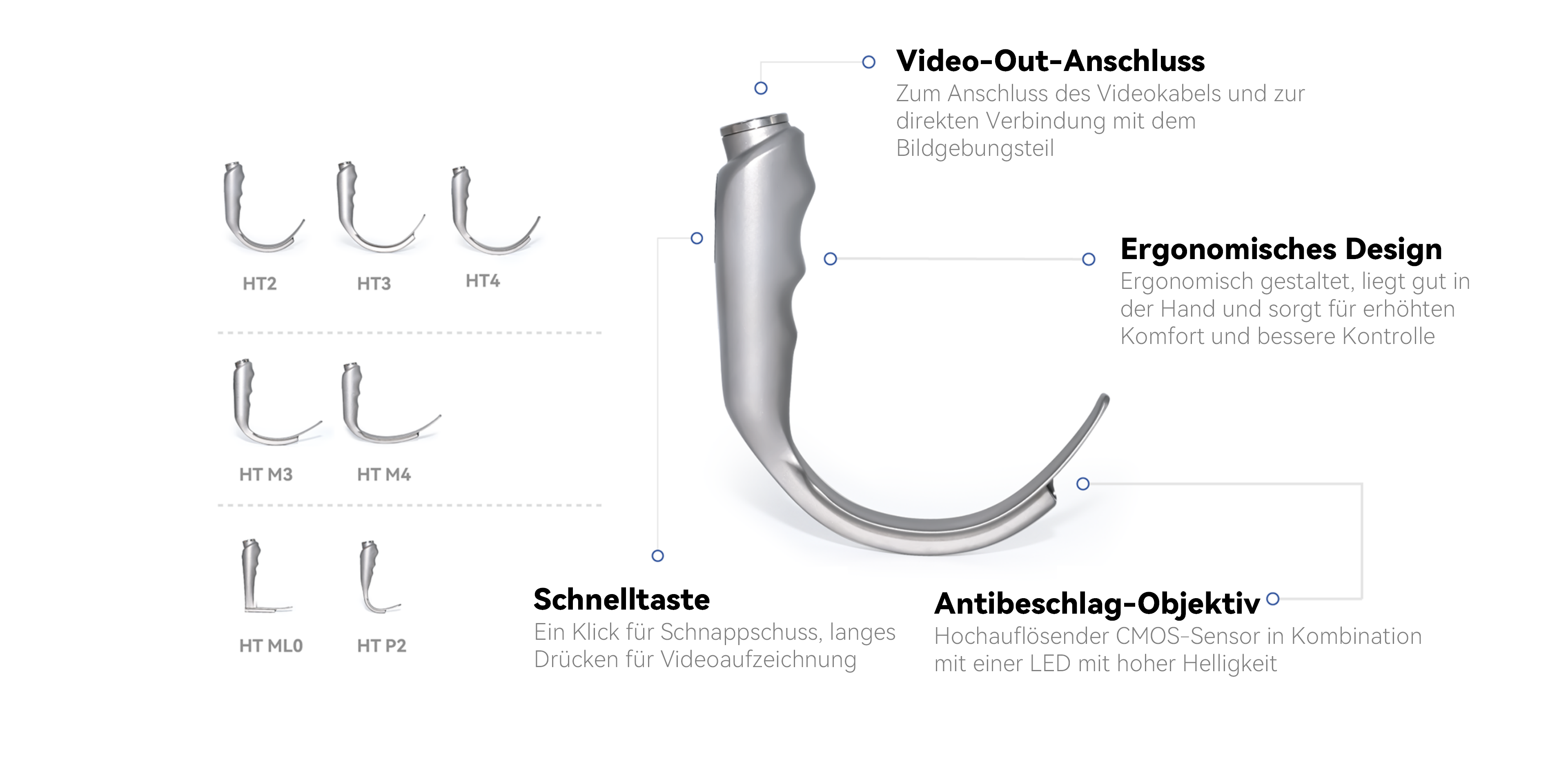 Der VL4REX fungiert als Videolaryngoskop durch verschiedene Kombinationen aus Bildgebungseinheit, Kabeln, abnehmbaren Griffen und wiederverwendbaren Laryngoskop-Spateln. Das Produkt ist breit einsetzbar in Abteilungen, in denen Intubationen erforderlich sind, wie Notaufnahmen, Operationssälen und Intensivstationen. Seine hohe Portabilität sowie die große Auswahl an Spateloptionen ermöglichen einen komfortablen Einsatz in unterschiedlichsten Anwendungsszenarien.