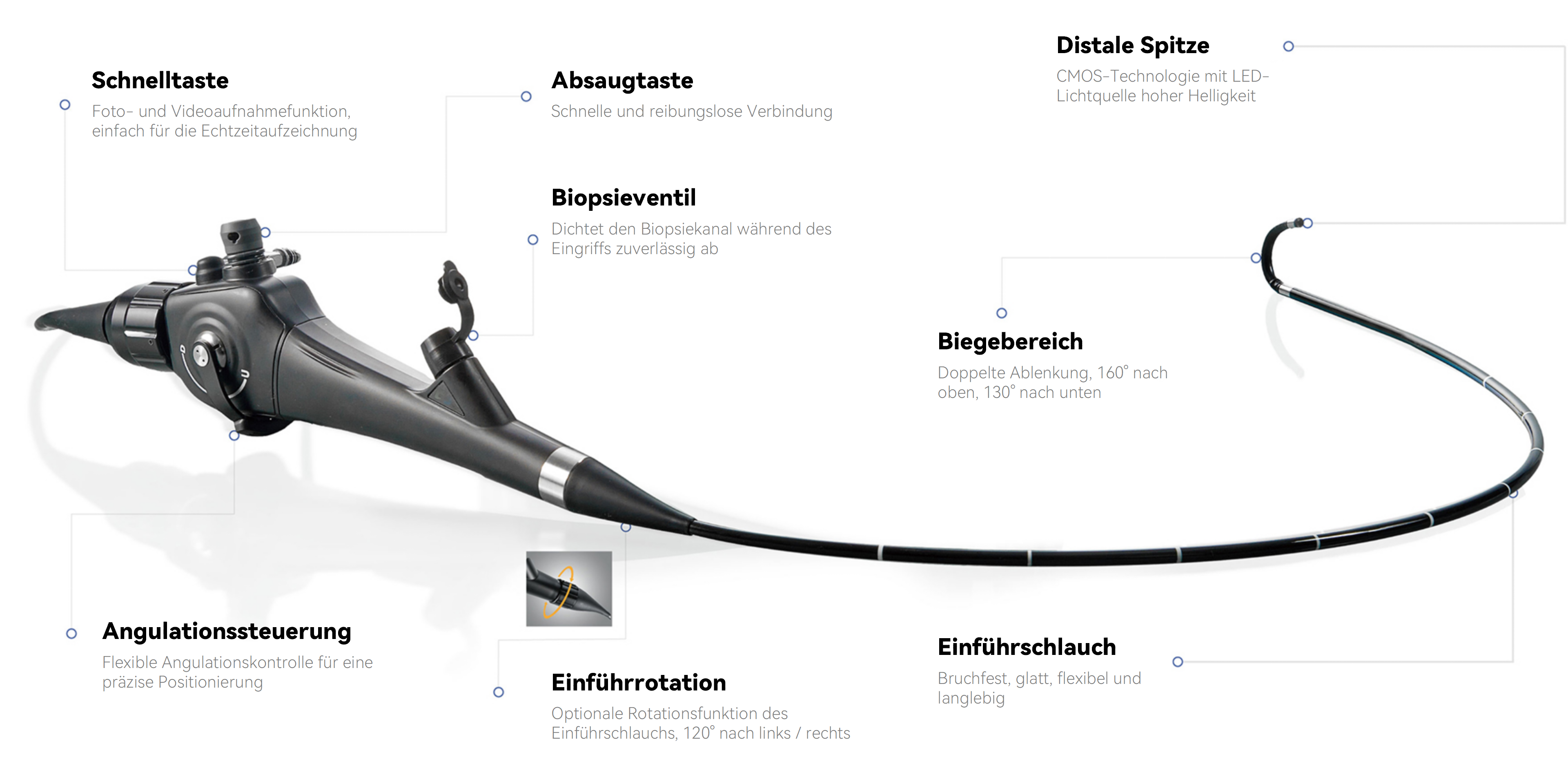 Der Griff integriert eine Schnellzugriffstaste für Schnappschüsse und Videoaufnahmen sowie eine Saugfunktion und einen Hebel zur Steuerung des Biegewinkels, was die klinische Effizienz deutlich erhöht.