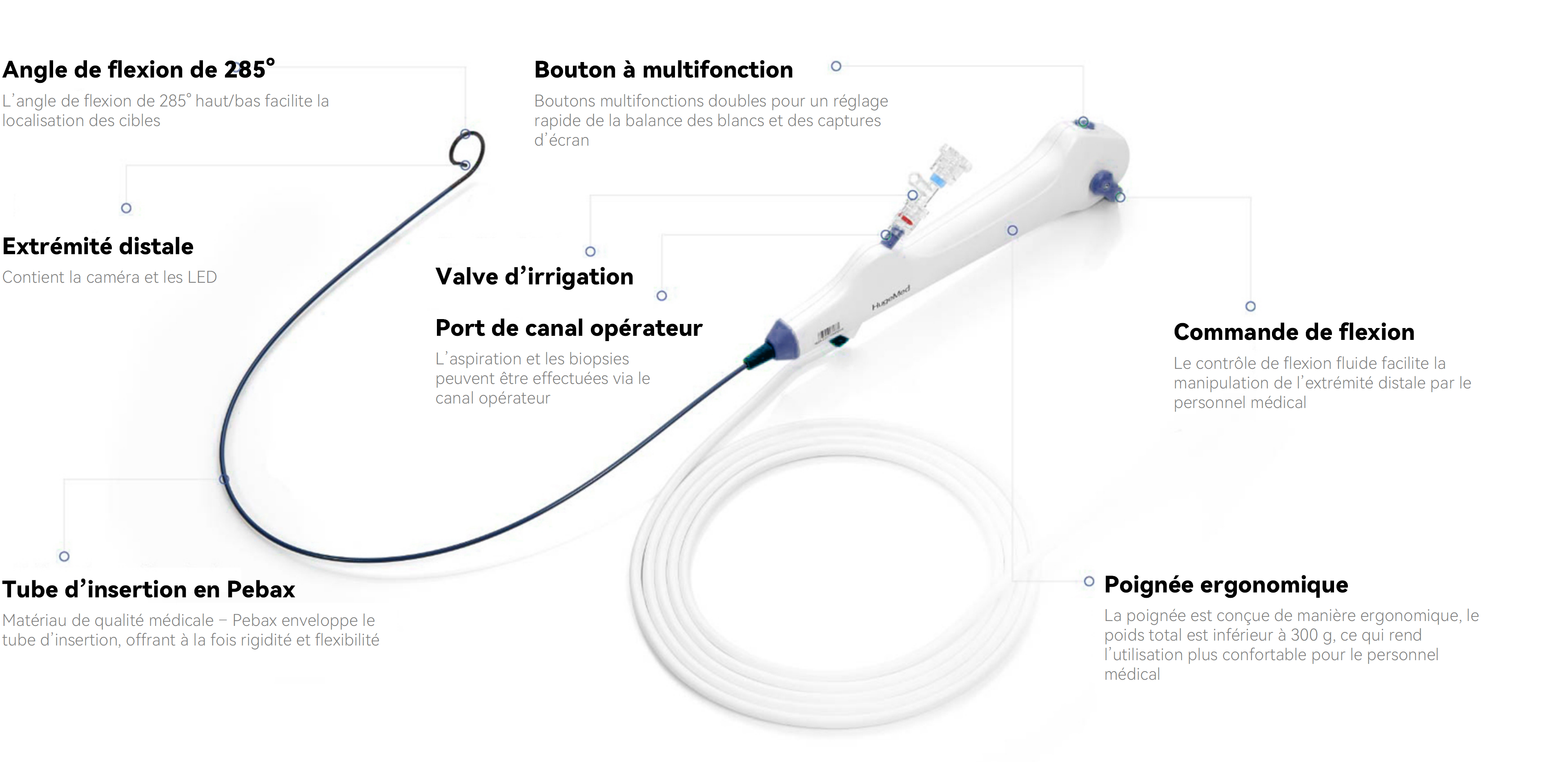 Pesant moins de 300 g, le HU30M réduit efficacement la fatigue du chirurgien lors des interventions longues. Ses fonctionnalités standards, incluant un bouton de réglage de l’angle, une amplitude de flexion de 285°, un algorithme d’optimisation en 1080p et une fonction de flexion passive, permettent aux médecins de réaliser aisément même les interventions les plus complexes.