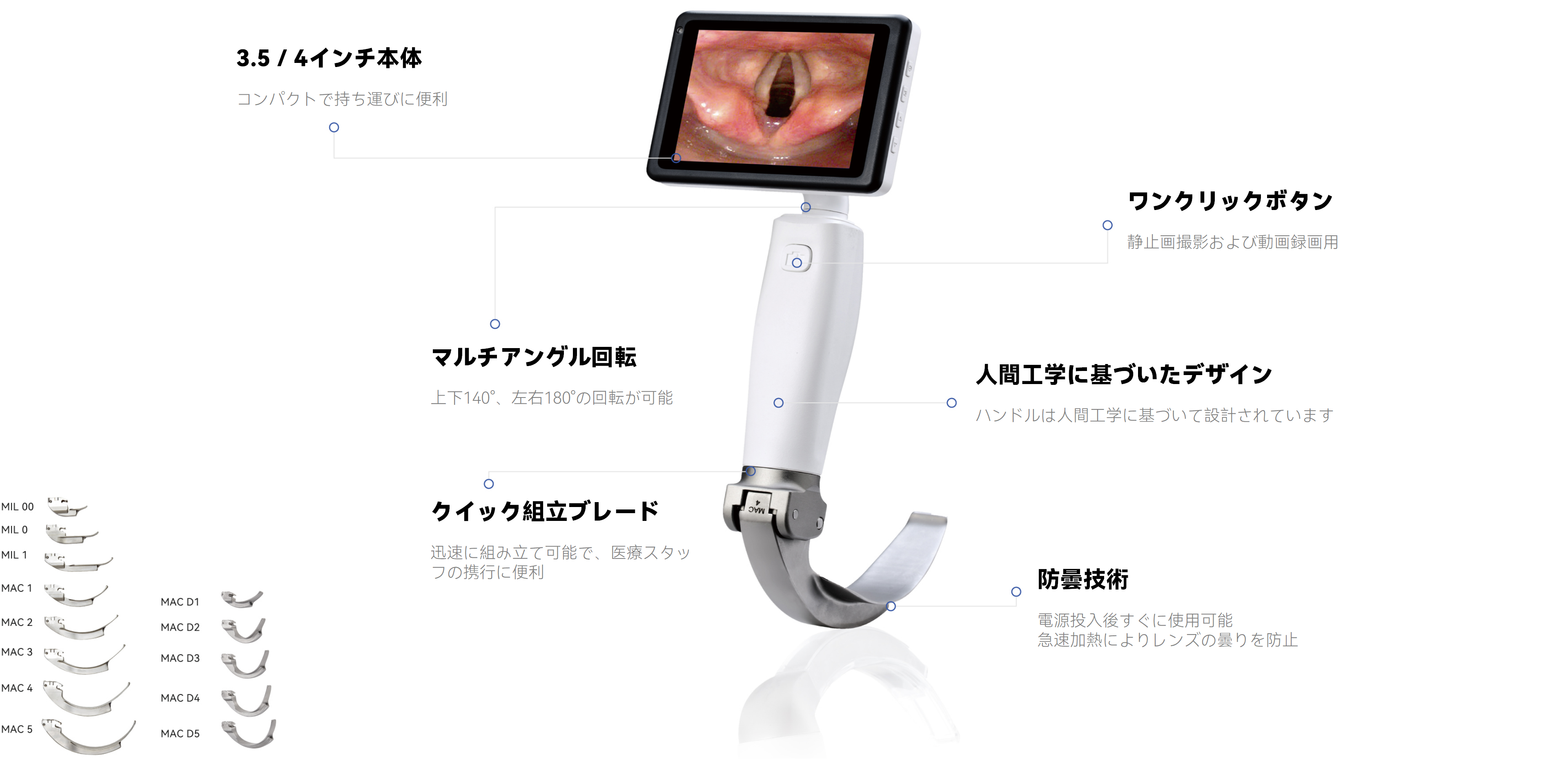 3.5/4 インチ LCD 全視野・無反射・高精細ディスプレイは、上下 140°・左右 180° の回転に対応。200 万画素の防曇カメラ と組み合わせることで、医師の視野確保と観察をより容易にします。