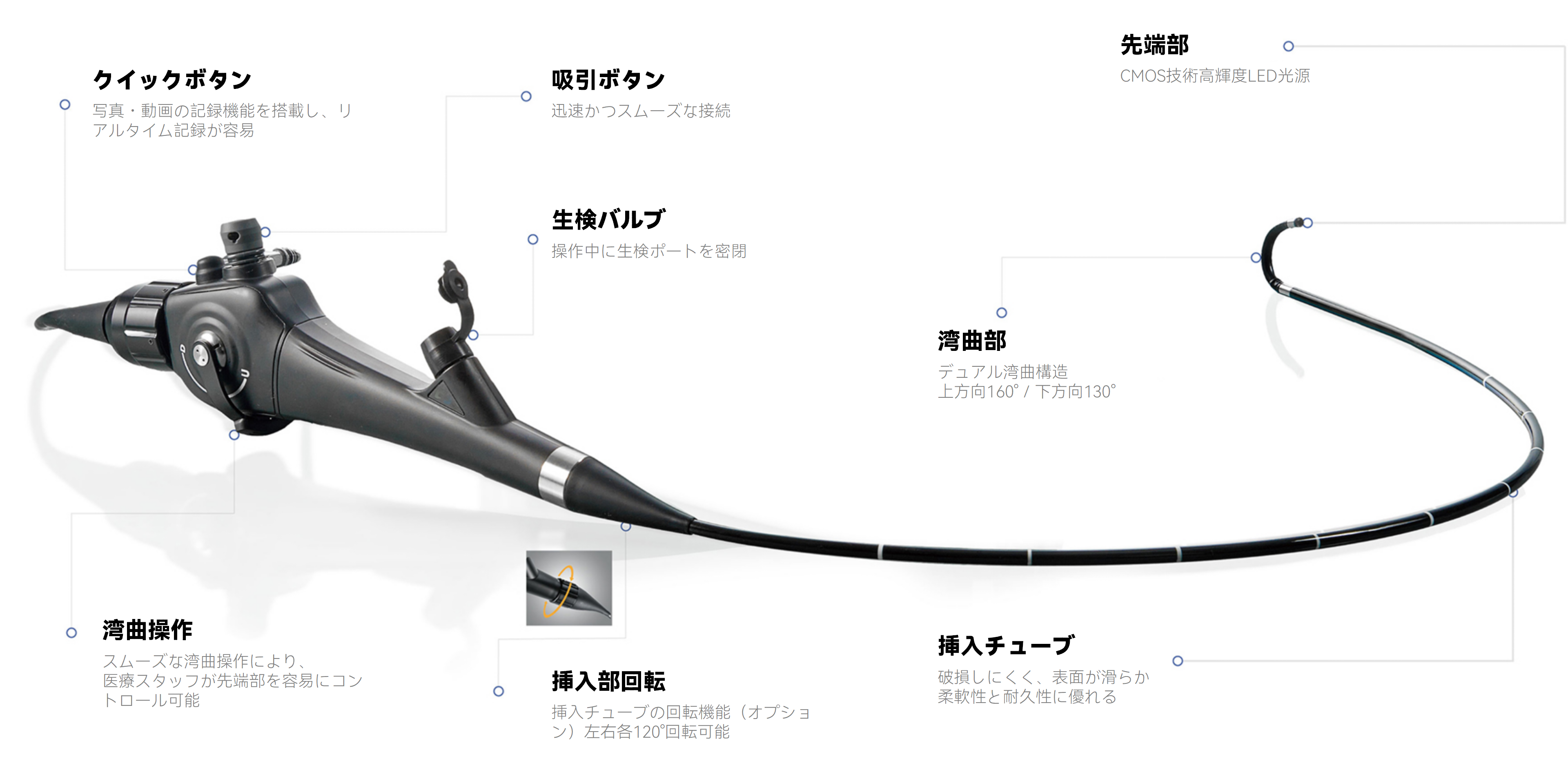 ハンドルには静止画撮影・動画録画用のクイックボタン、吸引機能、湾曲角度コントロールレバーを統合し、臨床効率を大幅に向上させます。