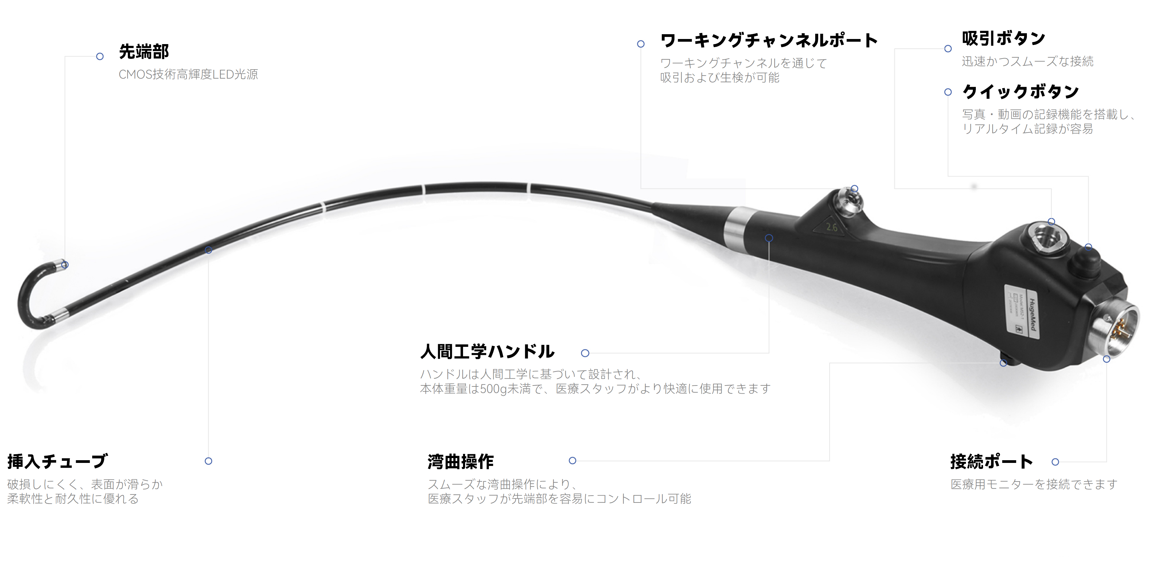 ハンドルには静止画撮影・動画録画用のクイックボタン、吸引機能、湾曲角度コントロールレバーを統合し、臨床効率を大幅に向上させます。