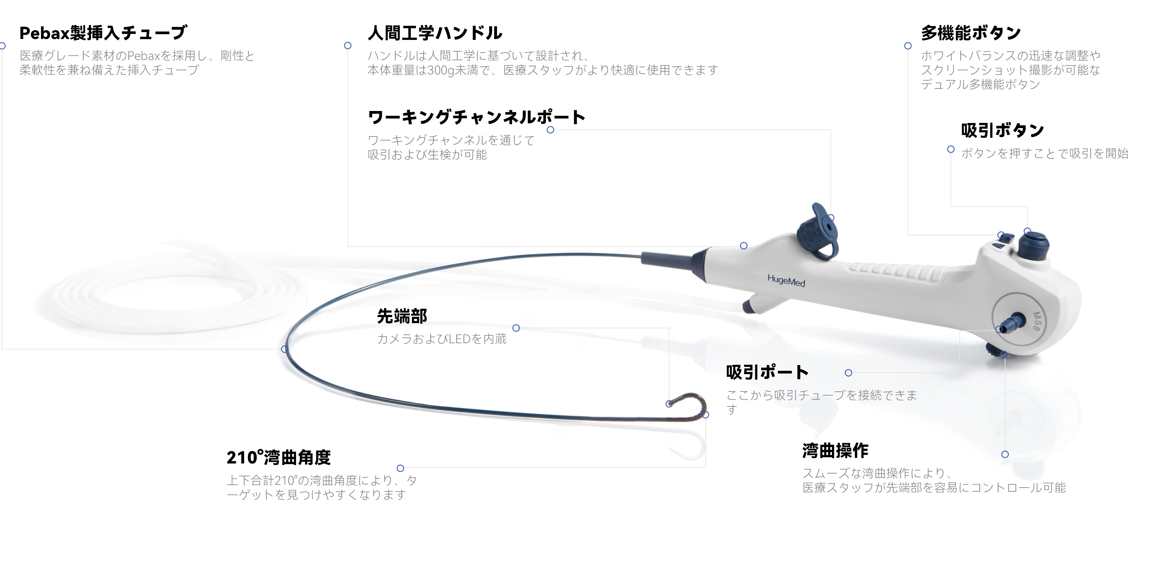 挿入部先端の 上下 210° の湾曲角 と パッシブベンディング設計 により、難しい角度の克服をサポートし、目標部位へのスムーズな到達と「精密診療」を実現します。