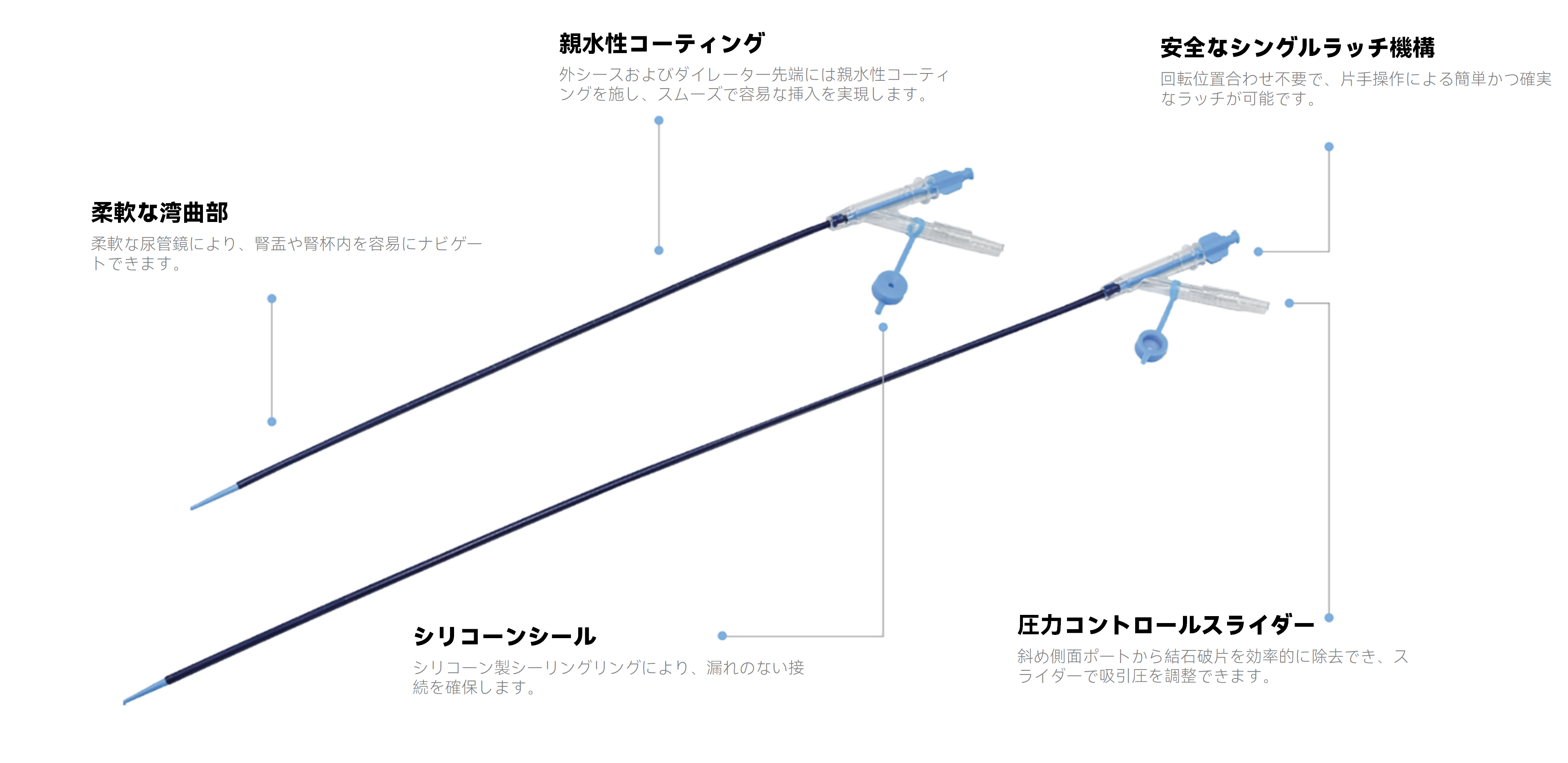 超細軟性鏡 × 超細負圧シースは40/45/50/55 cm の 4 種の作業長 と8.5/10.5、9/11、10/12、11/13、12/14 Fr の多口径から選択でき、柔軟な組み合わせにより 全 20 モデル をラインアップ。超細径アプローチから通常の負圧吸引まで、多層的な臨床ニーズをカバーします。