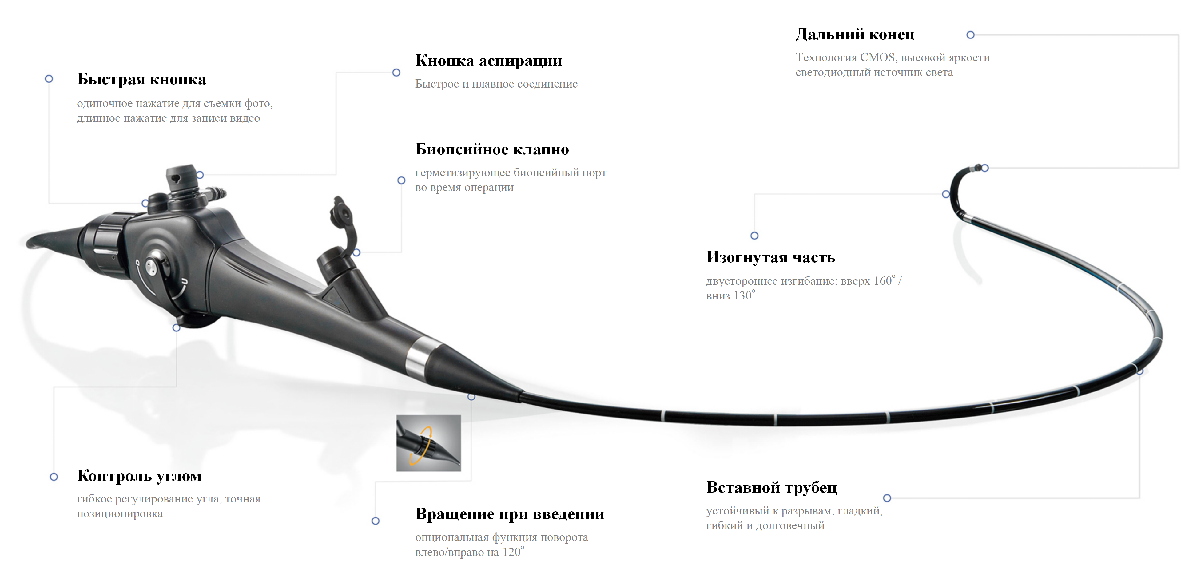Рукоятка оснащена кнопкой быстрого доступа для съемки и записи видео, а также функцией отсасывания и рычагом управления углом изгиба, что повышает клиническую эффективность.